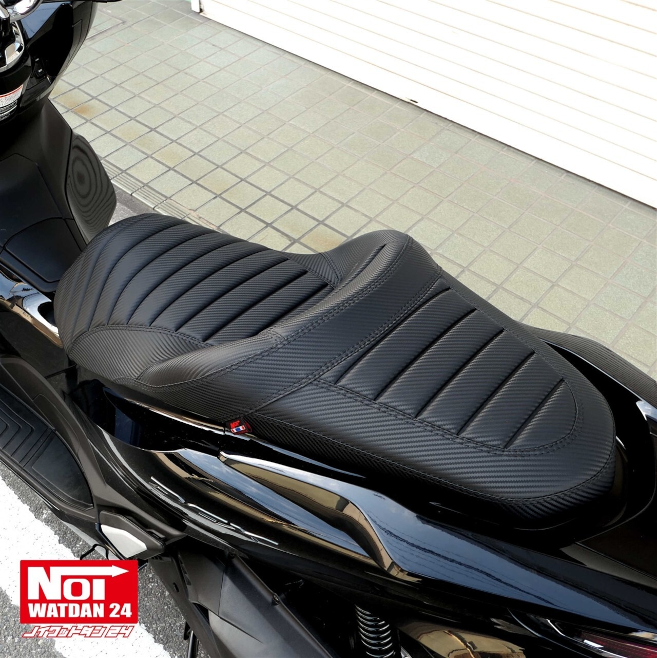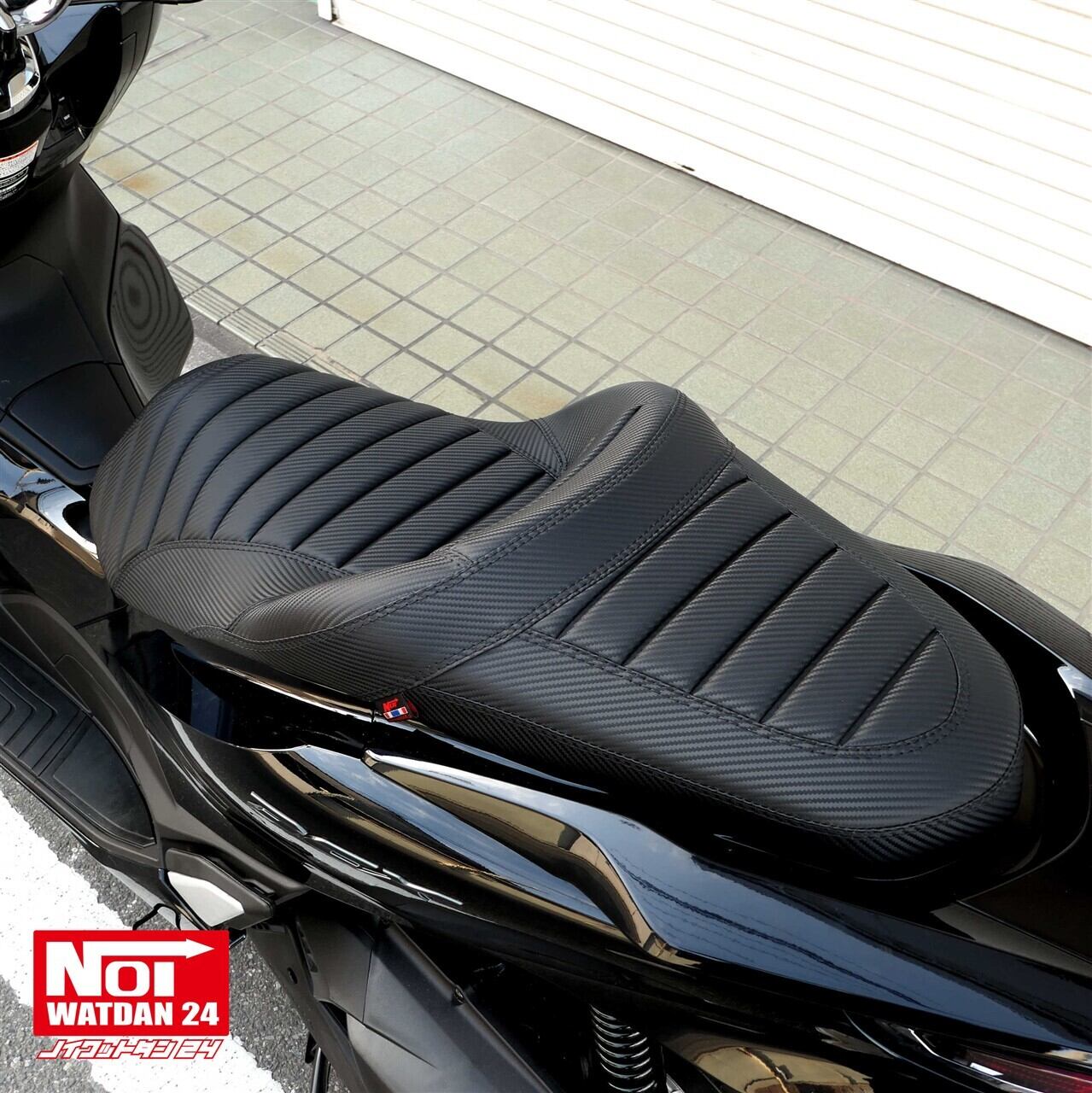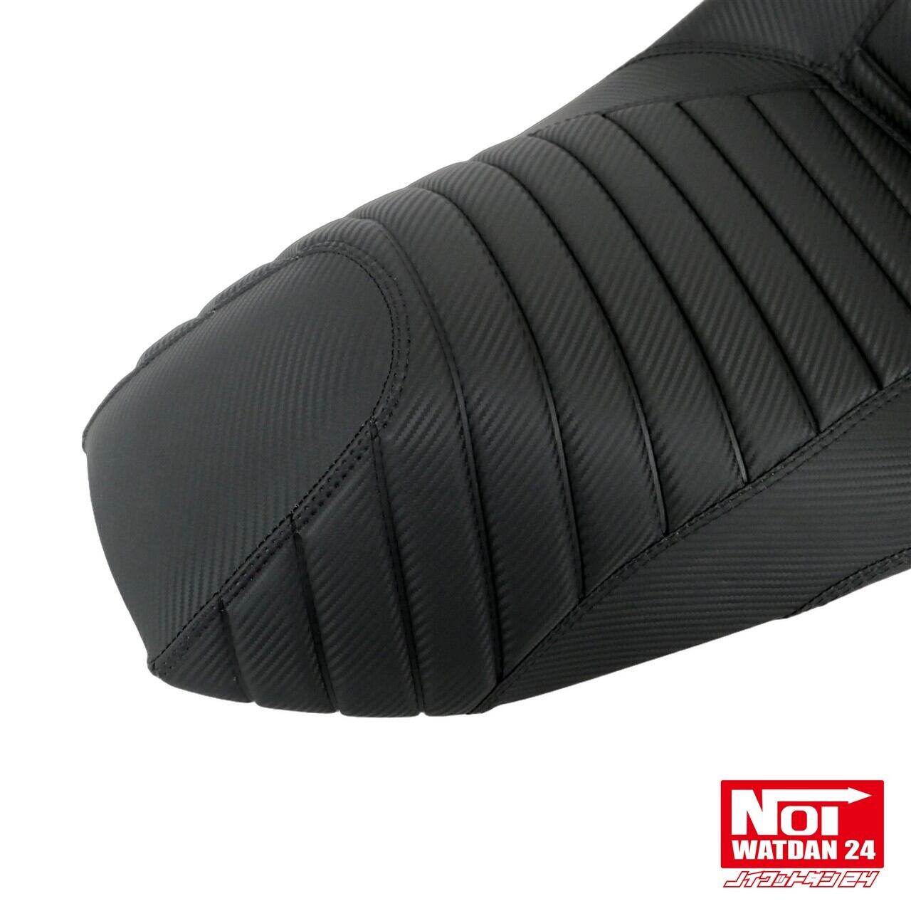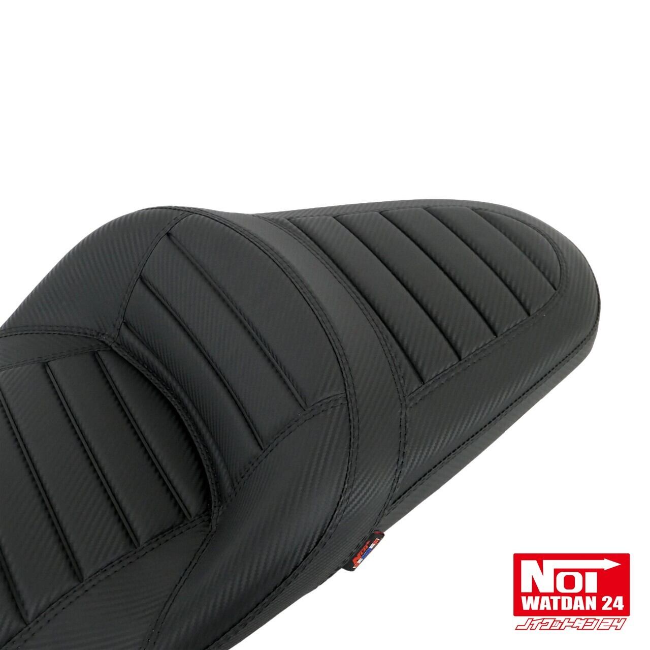 ローダウンと段付き加工を施したタックロールシートにカーボン調レザーでスタイリッシュな仕上がりのPCX用カスタムシート。