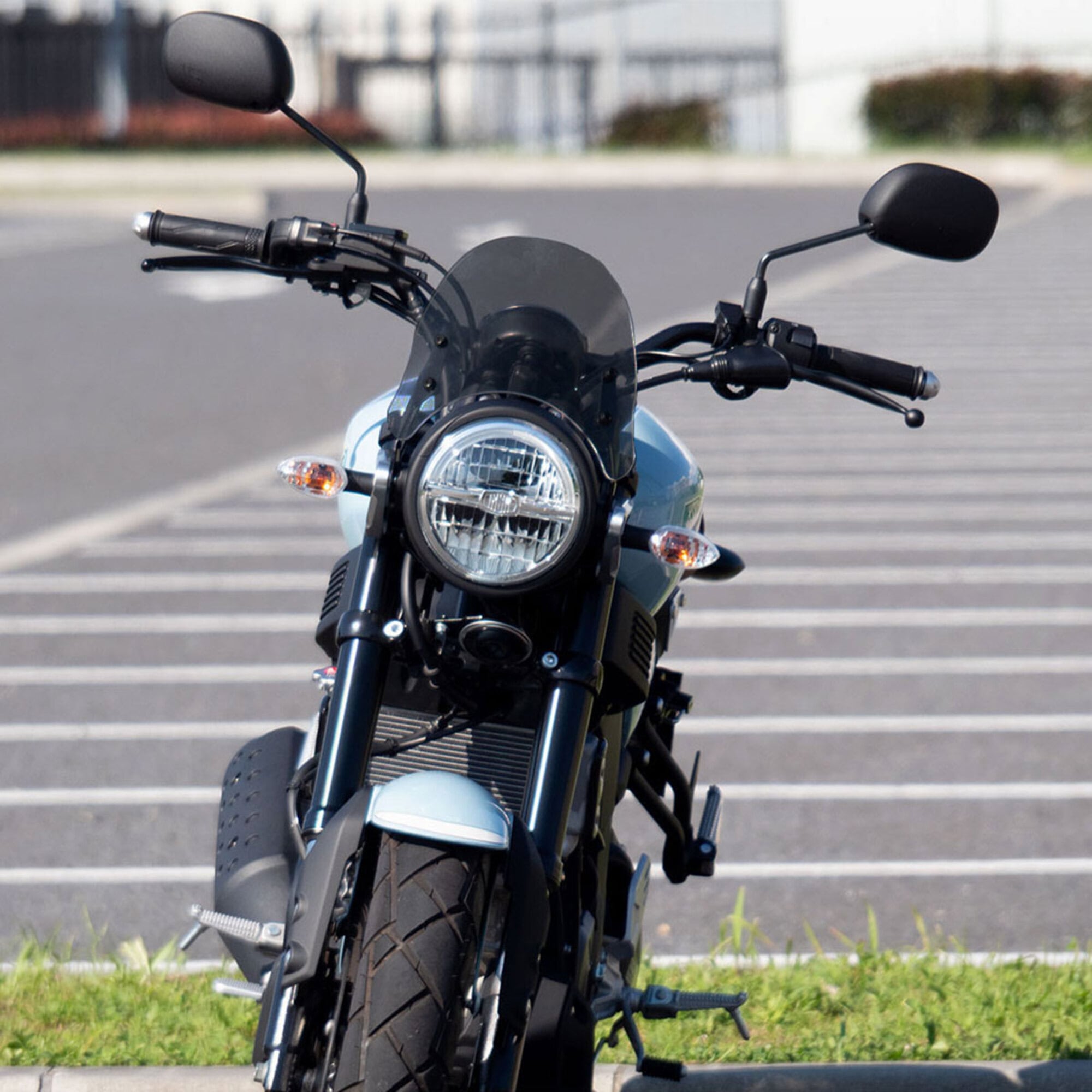 小ぶりながら身体の中心部分の風をしかっりと緩和させてくれる上、コンパクトな見た目で車体に馴染むデザインのショートタイプバイザー。